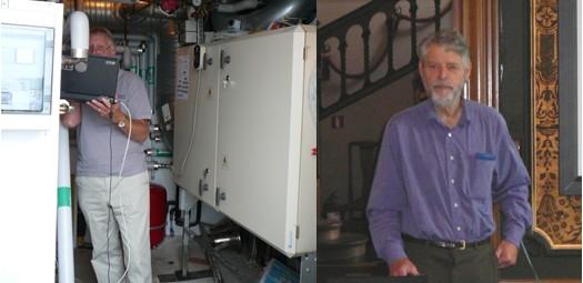 Naľavo Mike Creamer z Anglicka s Climachckom napojeným na TČ, ktoré malo priškrtený prívod na kondenzátor, čo sa prejavilo na zvýšenej kondenzačnej teplote, väčšom delta T na kondenzátore, zhoršenom COP a zníženom vykurovacom výkone. Napravo Guy Hundy vysvetľuje izoentropickú a skutočnú účinnosť otvoreného, polohermetického a hermetického kompresora s invertorom (straty pri konverzii) a bez neho. Izoentropická účinnosť kompresora má byť v rozmedzí 60-70 %. Ak je nižšia ide väčšinou o čiastočné zaťaženie a ak je vyššia o preľaženie kompresora. Najvyššie i najvyrovnanejšie účinnosti dosahujú piestové, potom skrutkové a skrol kompresory. Podobne sú analyzované hodnoty prehriatia, podchladenia, delta T na výmenníkoch.