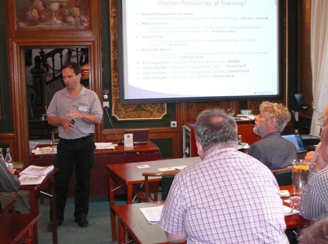 Naľavo Mike Creamer z Anglicka s Climachckom napojeným na TČ, ktoré malo priškrtený prívod na kondenzátor, čo sa prejavilo na zvýšenej kondenzačnej teplote, väčšom delta T na kondenzátore, zhoršenom COP a zníženom vykurovacom výkone. Napravo Guy Hundy vysvetľuje izoentropickú a skutočnú účinnosť otvoreného, polohermetického a hermetického kompresora s invertorom (straty pri konverzii) a bez neho. Izoentropická účinnosť kompresora má byť v rozmedzí 60-70 %. Ak je nižšia ide väčšinou o čiastočné zaťaženie a ak je vyššia o preľaženie kompresora. Najvyššie i najvyrovnanejšie účinnosti dosahujú piestové, potom skrutkové a skrol kompresory. Podobne sú analyzované hodnoty prehriatia, podchladenia, delta T na výmenníkoch.