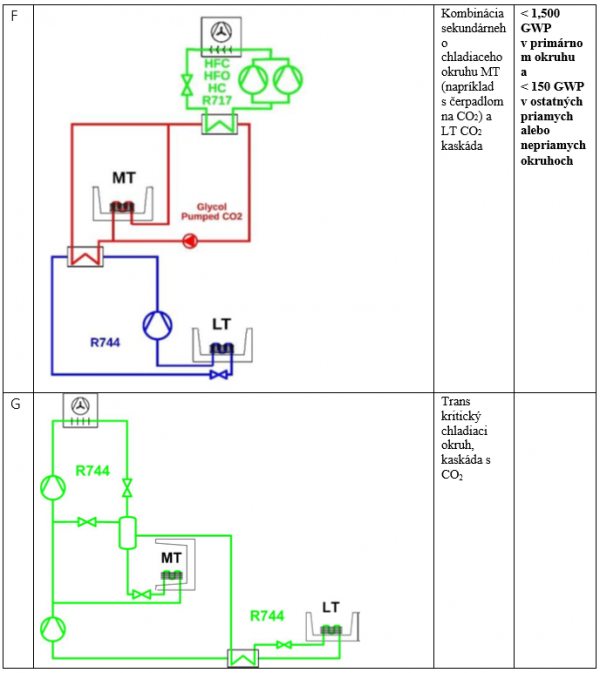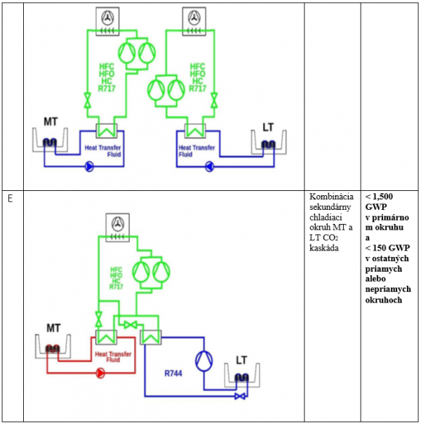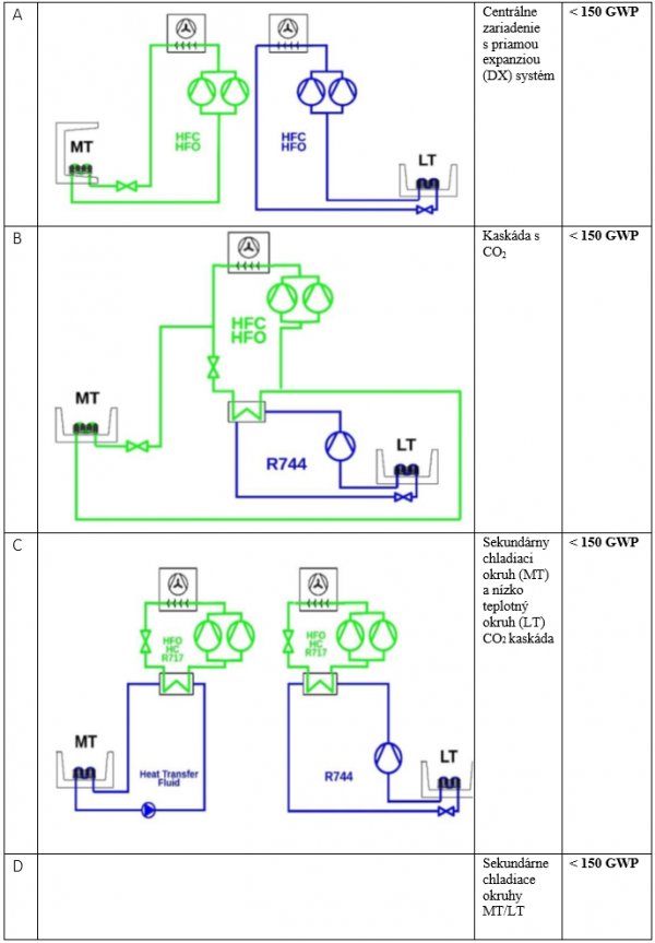 Alternatívne riešenia centrálnych chladiacich systémov sú prezentované nižšie v schematickom zobrazení, aby sa ukázali možné dovolené systémy po roku 2022. Všeobecne platí, že akýkoľvek systém, ktorý nepoužíva chladivá s GWP >150 bude dovolený. Koneční používatelia môžu tiež používať rozdelené systémy, ako sú napríklad systémy používajúce samostatné, nezávislé chladiace jednotky.