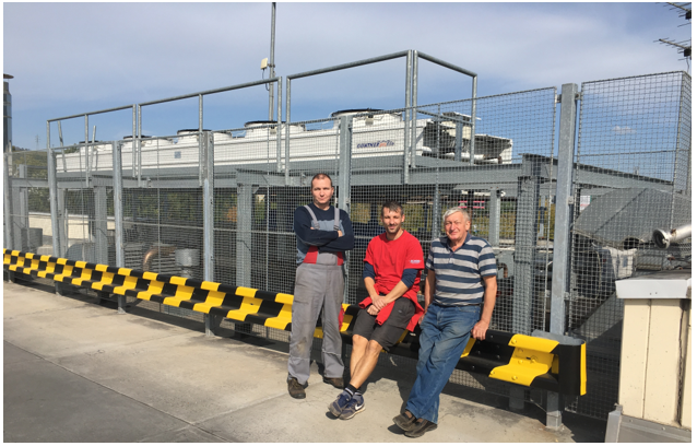 Sprava Vladimír Kubík, Jozef Náčin a Ján Selecký zo spoločnosti ECHOS Banská Bystrica pred ohradeným priestorom na Kauflande s kondenzátorom chladiaceho obehu s R134a s poistnými ventilmi s výfukom do okolia z podkritického mraziaceho okruhu s CO2
