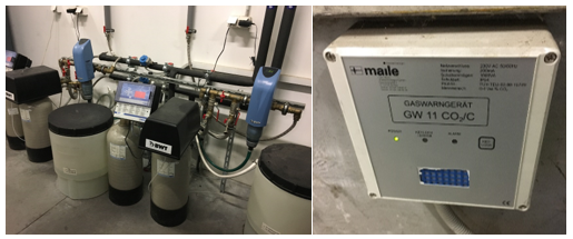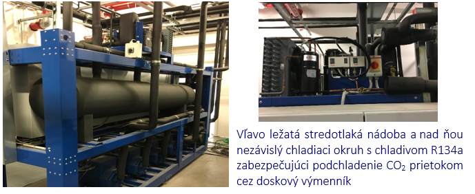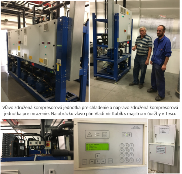 Naľavo chladiaca jednotka na podchladzovanie kvapalného CO2. V strede ovládacia jednotka, ktorá zobrazuje všetky prevádzkové stavy pripojených vitrín, boxov, ... vrátane vypočítaných hodnôt ako sú prehriatie na výparníku, nasávacie prehriatie, rozdiely teplôt na výparníku a podobne. Napravo skrinky s prevádzkovou dokumentáciou, záznamníkov, ...
