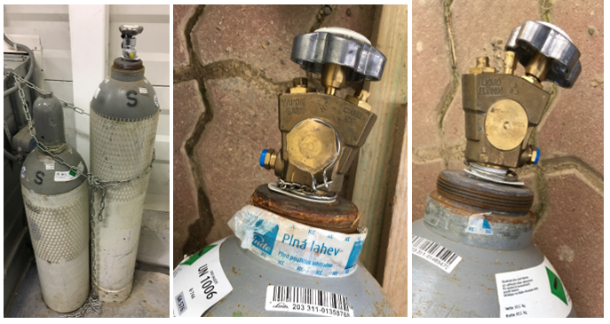 Fľaše bez vnorenej rúrky alebo s vnorenou rúrkou označené ako „T“ ako Tauchrohre – v nemčine „Stúpačka / Ponorná trubica“ alebo „S“ sifón. Pri plnení okruhu kvapalnou fázou nesmie tlak klesnúť pod trojný bod, inak sa vytvorí zátka suchého ľadu, pred ktorou môže tlak narastať a spôsobiť vystrelenie zátky, pretrhnutie rúrky, hadice, ktorú môže nebezpečne rozkmitať.