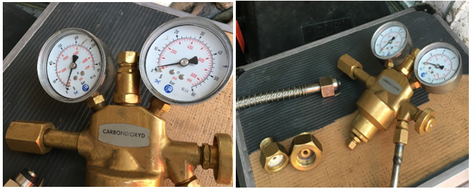 Naľavo plniaca armatúra – redukčný ventil z max 200 na 60 bar pre plnenie buď plynným alebo kvapalným CO2. Na pravom obrázkupodľa skupenstva sa volí redukcia na typicky hydraulickú ohybná oceľovú hadicu s väčším prierezom pre plyn a s menším pre kvapalinu.