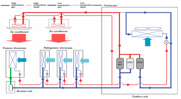 Napravo systém Conveni Pack, ktorý firma ECHOS inštalovala v najnovšej Bille s názvom „Terminál“ Banská Bystrica s chladivom R410A. Na obrázku je v režime tepelné čerpadlo v zime, kedy- kondenzačné teplo odberané z chladiacich a mraziacich boxov nepostačuje na vykurovanie cez vnútorné klimatizačné jednotky. Chýbajúce teplo sa odoberá z vonkajšieho prostredia a transformuje na vyššiu teplotnú úroveň.