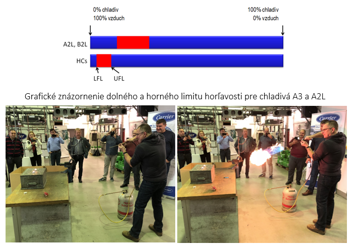 Vilím Mergl vychádzal pri ukážkach s dolného a horného limitu horľavosti a splnenia troch podmienok horenia = palivo+kyslík+zdroj zapálenia. Ak jedna chýba horenie nenastane. Na obrázku je vidieť podstatne nižší dolný limit horľavosti (LFL), ale aj horný (UFL) pre napríklad propán (HCs) voči R32 (A2L). Ak koncentrácia vo vzduchu nie je v rozmedzí 1,7 až 10,9 %, potom horenie nenastane. V gramoch to je 38 až 243 g/m3. Praktický limit pre použitie propánu 7,6 g/m3, čo je 0,008 kg/m3.
