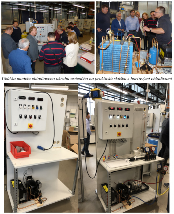 Naľavo predná časť skompletizovaného chladiaceho okruhu s kondenzačnou jednotkou vrátane elektrického pripojenia. V strede zadná časť s výparníkovou jednotkou a napravo predpripravený pracovný stôl ku skúške. Podobne v rámci prípravy na Euroskills sme na Zväze (Správy 7/2018) skompletizovali chladiaci okruh, ktorý je schopný samoregulácie s kontinuálnym chodom. Takáto práca je už časovo náročná a takúto skúšku bude potrebné oddeliť od skúšky podľa Nariadenia.