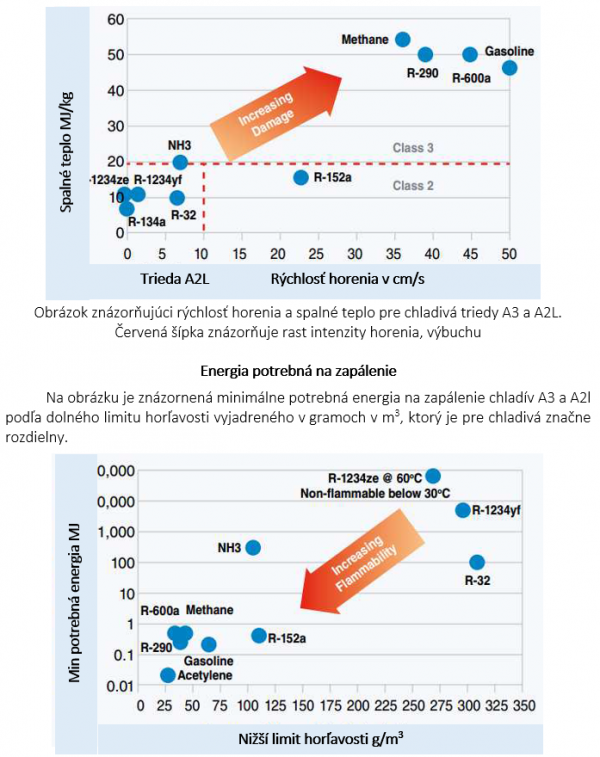 Obrázok znázorňujúci energiu potrebnú na zapálenie chladív triedy A3 a A2L.