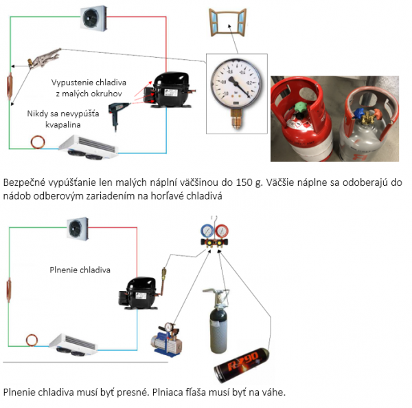 Rozdiel vo vývevách pre horľavé a nehorľavé chladivá podľa V. Mergla je len v štítkoch a v cene. Odberové zariadenie používajú určené pre A2L chladivá vo vratných nádobách.