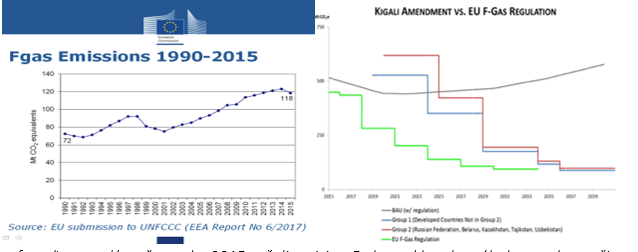 Z grafu naľavo vyplýva, že v roku 2015 začali emisie z F plynov klesať, v súlade so zelenou čiarou na grafe napravo s kvótami podľa Nar. 517/2014/EÚ