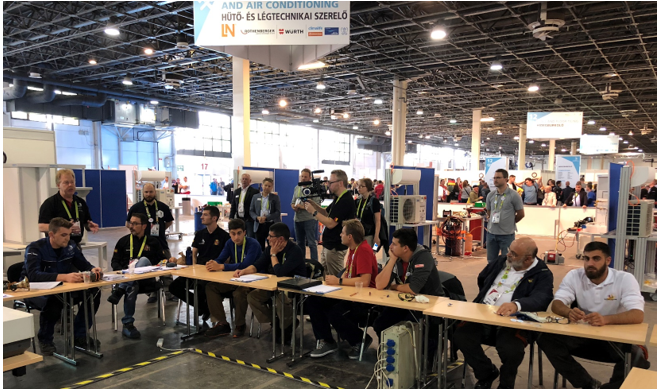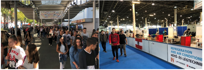 Naľavo výstavisko HungExpo v Budapešti bolo počas Euroskills preplnené účastníkmi zo škôl nielen v Maďarsku, ale aj z okolitých krajín. Jednu z najmasívnejších i najúspešnejších účastí mali Rakúšania, ktorí budú organizovať Euroskills v roku 2020 v Salzburgu. Napravo priestor v hale A na súťaž mechanikov chladiacich zariadení s deviatimi pracoviskami, so skladom, priestorom pre počítač a zhromažďovanie účastníkov a expertov
