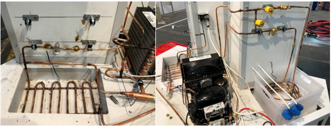 Naľavo riešenie nemeckého a napravo ruského súťažiaceho. Ruský súťažiaci zvolil umiestnenie expanzného ventilu ďaleko od výparníka a preto potrubie vystupujúce z EV izoloval. Dosiahol ako jeden z mála súvislú ľadovú plochu, ale zabudol odstaviť odmrazovanie, čím znemožnil požadovanú nonstop prevádzku chladiaceho okruhu.
