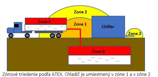 1. Ak výrobca systému definuje časť inštalácie ako ATEX zónu vzhľadom na požiadavky, podmienky miesta inštalácie. Potom výrobca systému a inštalatéri sú žiadaní zaistiť, aby všetky komponenty v tejto zóne mali zodpovedajúce schválenie. Bezpečnostné normy vyžadujú, aby výtlačná rúrka s výfukom z bezpečnostných ventilov chladiacich systémov viedla na bezpečné miesto. Niektorí výrobcovia chladiacich systémov sa rozhodnú definovať takéto miesto bezpečného výfuku ako ATEX zónu 2. Nie je bežné umiestniť nejaký komponent do tejto oblasti.